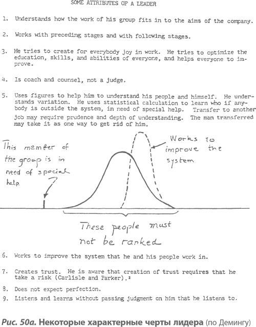 Страничка, озаглавленная «Некоторые характерные черты лидера», ходила по рукам на последних семинарах. Рисунок 50 – репродукция оригинала этой страницы. Как это часто бывает с Демингом, в немногих словах заключен глубокий смысл. Внимательное изучение этого рисунка дает некоторое понимание того, почему «учредите лидерство» – это и есть ответ по существу на вопросы, поставленные выше относительно пунктов 11 и 12. Между прочим, расширенный перечень, недавно показанный мне Биллом Шеркенбахом, также включает «Постоянно улучшайте свое образование» и «Создавайте больше лидеров». (Дальнейший относящийся к этому материал можно найти в книге «Выход из кризиса», стр. 118–119.)