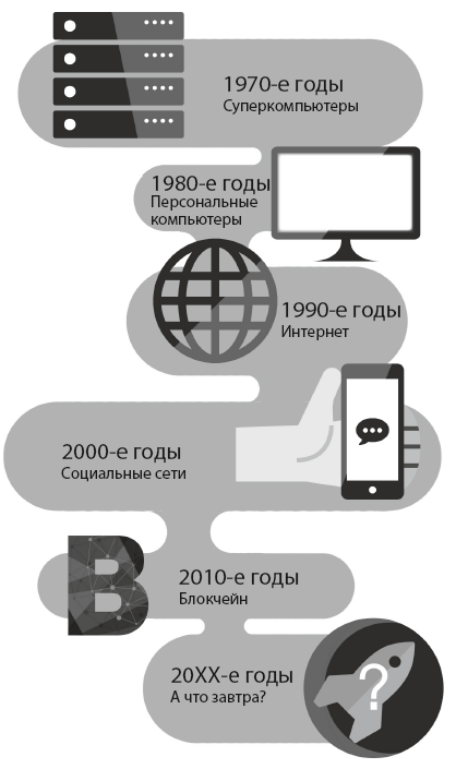 Технология блокчейна станет логическим развитием информационной революции, начавшейся с появления в 1970-х годах мэйнфреймов, затем в 1980-х годах – персональных компьютеров, а позднее, в 1990-х и 2000-х годах, – социальных сетей. Эти сорок лет развития технологий привели нас сегодня к технологии блокчейна и потенциальному разрушению старых систем работы.