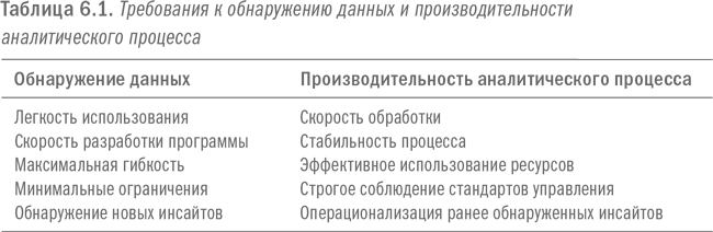 С точки зрения управления реальную проблему для операционной аналитики представляет наличие двух разных и даже противоречащих друг другу наборов требований, которые должны быть удовлетворены. Первый набор относится к процессу обнаружения данных, когда организация пытается найти новые инсайты и определить аналитические процессы, способные оказать наибольшее влияние. В этом случае требуются максимальная гибкость и минимальные ограничения. Второй набор требований относится к развертыванию процесса на операционном уровне. В этом случае главным приоритетом становится обеспечение высокой скорости, надежности и стабильности. Эти два набора требований приведены в табл. 6.1. Хотя они существуют сами по себе и даже, кажется, противоречат друг другу, но оба вполне выполнимы в рамках соответственно конфигурированного аналитического окружения.