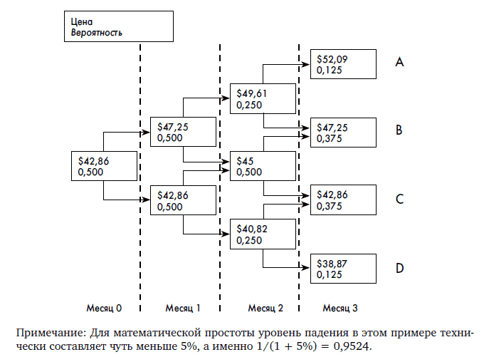 Продолжая пример, предположим, что у вас есть опцион на акцию компании, который истекает через три месяца. В течение каждого из этих месяцев цена акции может подняться или упасть на 5 % по отношению к цене конца предыдущего месяца. Далее предположим, что вероятность роста курса равна вероятности падения курса (это просто предположение, на практике все может быть иначе). Составим схему возможных изменений курса акции (см. с. 299).