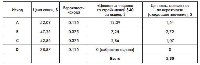 Мы знаем, что если вы реализуете свой опцион сейчас, то получите $5 прибыли. Давайте посмотрим, какую ожидаемую прибыль принесет опцион, если вы будете держать его до истечения срока действия. Это и будет его рыночная стоимость. Схема показывает, что существует много разных вариантов. Например, с вероятностью 12,5 % цена акции будет расти три месяца подряд, что в результате принесет вам уже $52,09 – $40 = $12,09 прибыли. Или же с вероятностью 12,5 % цена будет падать три месяца подряд. Однако обратите внимание, вы не понесете убытки. Если цена акции упадет до $38,87, то вы просто выбросите опцион и не будете покупать акцию. В этом основное преимущество опциона и его отличие от покупки акций – вы страхуетесь от убытков в случае падения курса акций.