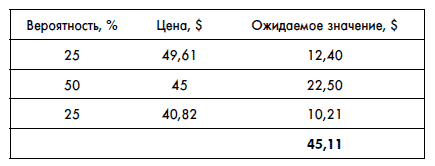 Какова же ожидаемая прибыль от опциона, т. е. его цена? Она будет равна ожидаемому значению прибыли (по-английски expected value), т. е. возможным конечным значениям, взвешенным по вероятности: