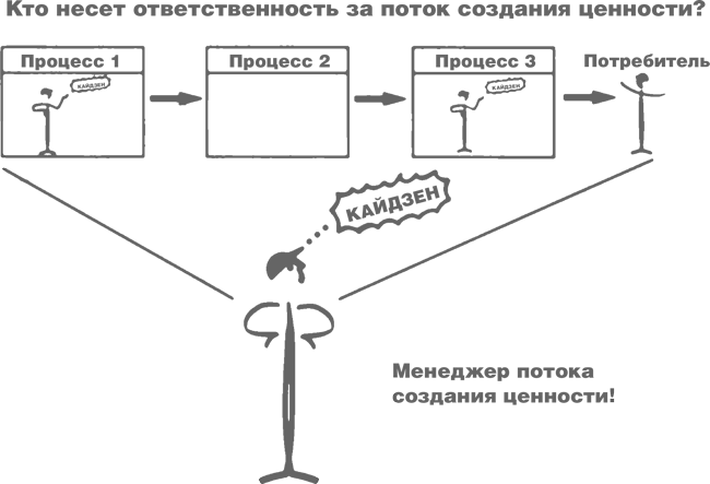 Многие люди вовлечены в процесс бережливого производства, и всем надо понять, как создавать и читать карту будущего состояния. Но также необходимо, чтобы команду, выполняющую построение карт и внедрение будущего состояния, возглавлял лидер, способный видеть весь поток в границах создания ценности продукта и осуществлять перемены. Улучшение потока создания ценности (кайдзен потока) – это управление процессом кайдзен.
