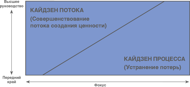 И кайдзен потока (улучшение потока создания ценности), и кайдзен процесса (исключение потерь на уровне цеховой команды) нужны в вашей компании: улучшение в одном влечет улучшение другого. Кайдзен потока сфокусирован на материальном и информационном потоках (для чего надо видеть поток целиком), а кайдзен процесса ориентирован на людей и ход процесса.
