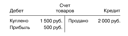 По правилам Шибе и Одерманна, произошло увеличение ценностей на 1500 руб., поэтому счет дебетуется. Затем произошло уменьшение ценностей, поэтому счет кредитуется на 2000 руб. Продажа товаров произошла по цене более высокой, чем цена себестоимости, что в конечном итоге дает разницу в 500 руб., что характеризует изменение ценности проданной партии товара в момент ее продажи. Так как это изменение дало увеличение ценности товара, то на эту разницу счет товаров и должен быть дебетован в момент установления размеров указанной разницы. На сумму разницы, отраженной по дебету счета товаров, должен быть кредитован счет прибылей и убытков.