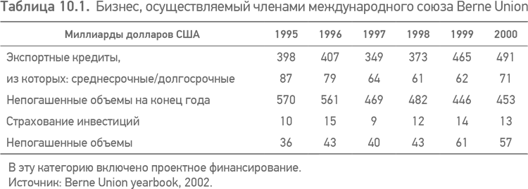 Бизнес, осуществляемый членами международного союза Berne Union, в последние годы был следующим (табл. 10.1).