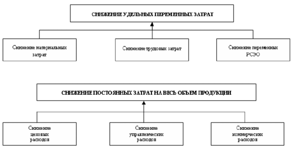 Снижение расходов по этим направлениям чаще всего связано с организационными изменениями в компании. В схематичном виде основные мероприятия по снижению удельных переменных затрат и постоянных затрат на весь объем продукции представлены на рисунке 7.3.