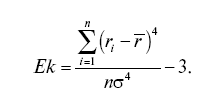 Коэффициент эксцесса показывает, насколько вершина нормального распределения находится ниже или выше, чем в случае рассмотрения реального распределения доходности. Он принимает положительные значения, если вершина нормального распределения занижена относительно реального распределения, и отрицательные – если завышена.