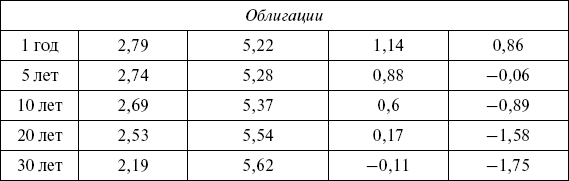 Показатели эксцесса по облигациям также позволяют утверждать, что исходя из реального распределения доходности облигации имеют лучшее соотношение риска и доходности, чем это показывает нормальное распределение доходности. Например, ярко выраженный коэффициент эксцесса, равный 0,86, свидетельствует о том, что в реальности разброс доходности по облигациям значительно меньше, чем это демонстрирует график нормального распределения доходности.