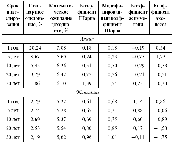 В табл. 8.5 представлены результаты проведенных расчетов по рынку США при инвестировании в акции и облигации на разные сроки. Сравнение эффективности инвестирования в акции и облигации по критерию «риск – доходность» проводится по классическому и модифицированному коэффициентам Шарпа.