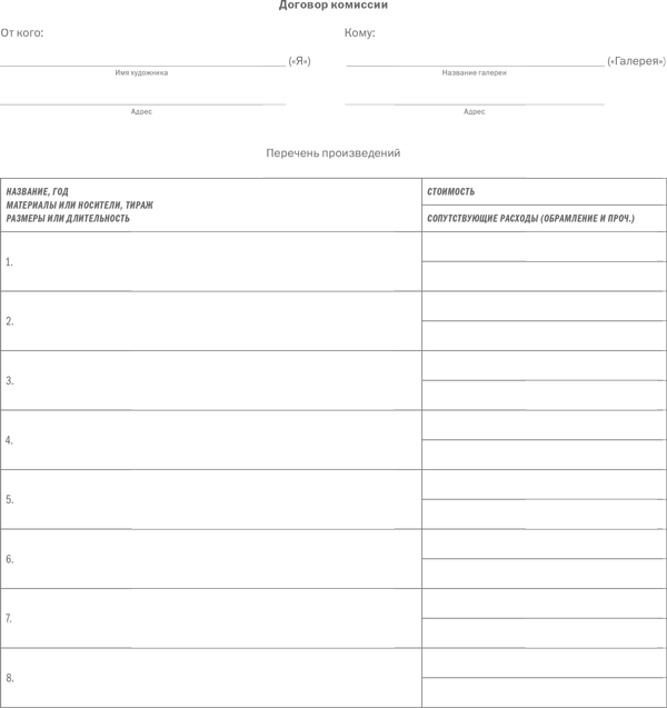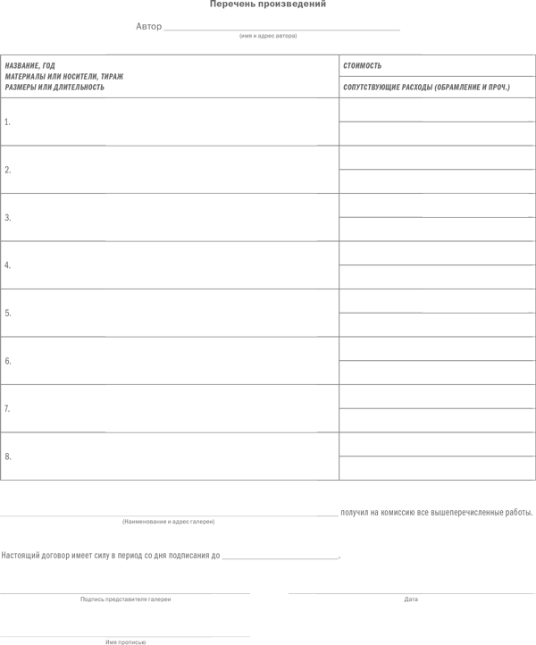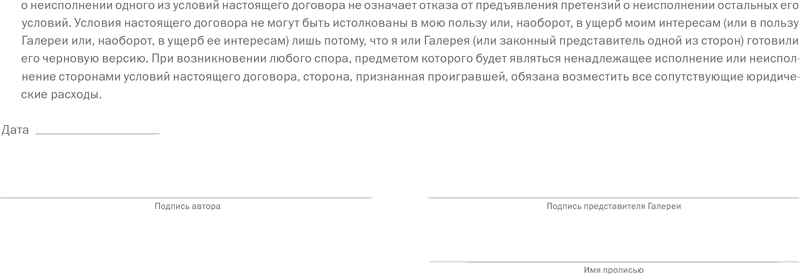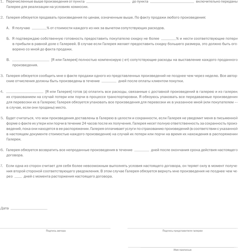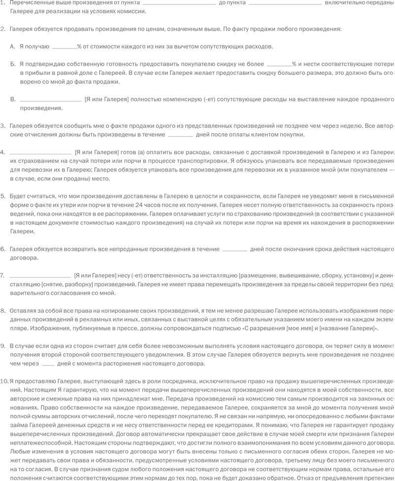 Не забудьте, что вы можете (и даже должны) внести в образцы изменения, которые отразят именно вашу ситуацию: мы приводим образцы договора как возможные варианты, а не как готовые к печати документы. Поэтому смело добавляйте, удаляйте и редактируйте любые предложения. То же может сделать и галерея или юрист, которому вы покажете черновик.