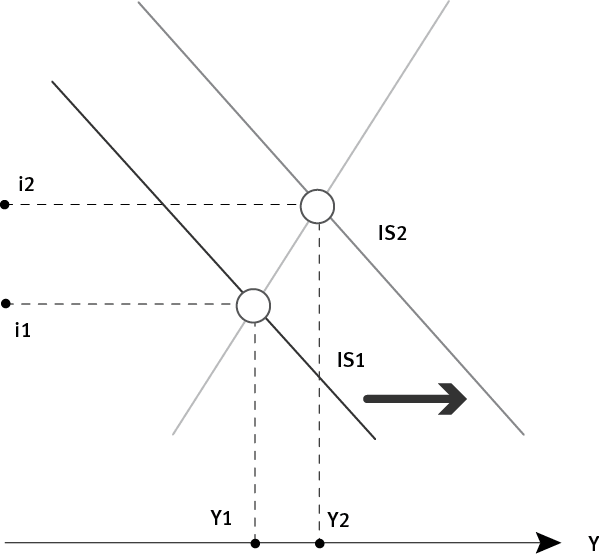 C помощью этой модели можно проиллюстрировать суть кейнсианского рецепта борьбы с безработицей. Чтобы увеличить занятость и выпуск, нужно наращивать государственное потребление: правительственные заказы, оплачиваемые из казны проекты и т. п. Такое увеличение сдвигает на этой простой картинке линию IS вправо и вверх. В новом равновесии – на пересечении линий IS и LM – выше уровень выпуска, а значит, и занятость. Линия LM при этом, как предполагалось, остается на месте. Кейнсианцы исходили из того, что, пока в экономике есть безработные, увеличение госрасходов никак не влияет на равновесие на денежном рынке.