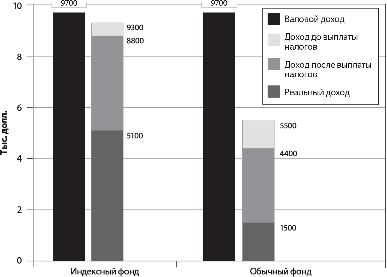В любом случае, при ожидаемом в будущем снижении доходностей по ценным бумагам индексные фонды с низкими затратами и налогами обеспечат своим инвесторам еще более высокую доходность (в сравнении с активно управляемыми фондами), чем по результатам рассмотренного нами ранее периода в 25 лет. Да, реальный доход в 5100 долларов на первоначально инвестированные 10 000 долларов за 10 лет – не самое выдающееся достижение. Но что тогда говорить о доходе в 1500 долларов от участия в обычном управляемом фонде акций?