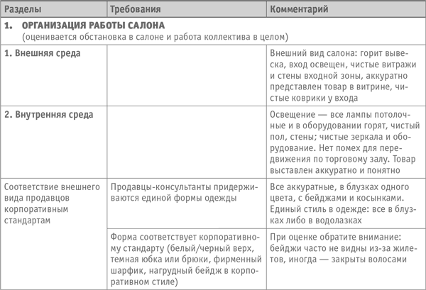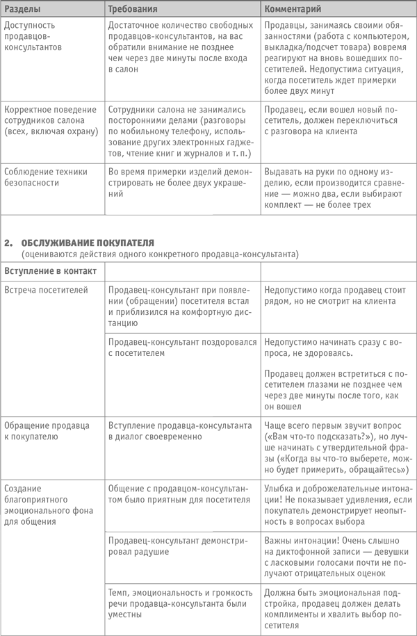 Решив «встряхнуть» персонал, мы в «Магии Золота» внедряли полномасштабную программу «Тайный покупатель» с привлечением внештатных специалистов. По ее результатам нам пришлось снова изменить структуру СКО. Стандарты мы расположили в той же последовательности, что и критерии оценки в анкете тайного покупателя.