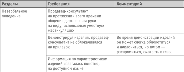 Но в один прекрасный момент наш руководитель, к слову сказать, новатор по духу, неутомимый участник тренингов и семинаров, решил, что пора подойти к программе «Тайный покупатель» более основательно. В компании появился менеджер проекта, которая разработала анкету и подготовила «тайников» с учетом специфики наших продаж. Она подробно рассмотрела принятые нами стандарты обслуживания и предложила оформить их в виде «Требований к продавцу». В результате появилось руководство для продавцов – инструкция, что они должны сделать в каждом рабочем процессе.