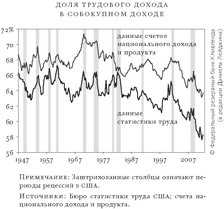 Статистические данные также указывают на то, что доля трудовых доходов в совокупном доходе снижается. В 1990 г. 63% совокупного дохода в США приходилось на заработную плату, а к середине 2011 г.— лишь 58%. Схожие тенденции наблюдаются и в других наиболее развитых странах — Германии, Франции и Японии. Данные тенденции берут свое начало примерно в 1980 г., однако следует учитывать, что показатель доли трудового дохода для отраслей, требующих высококвалифицированного труда, в англоязычных странах, наоборот, вырос — примерно на 5%.