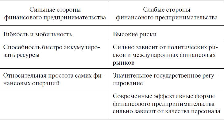 Таблица 6.4. Сильные и слабые стороны финансового предпринимательства