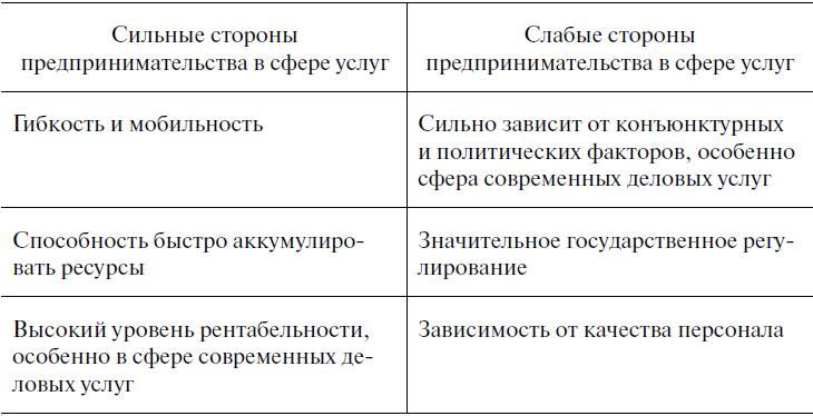 Таблица 6.5. Сильные и слабые стороны предпринимательства в сфере услуг