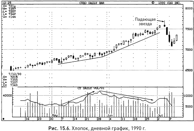 На рисунке 15.6 на протяжении мая увеличение открытого интереса сопровождалось восходящим трендом на ценовом графике, что отражало потенциал для дальнейшего роста. Менее оптимистично выглядела июньская картина: цены поднимались, а открытый интерес падал, и это означало, что движение вверх было вызвано, главным образом, закрытием коротких позиций. Падающая звезда в начале июля послужила сигналом разворота, который за считанные дни свел на нет почти все июньские завоевания.