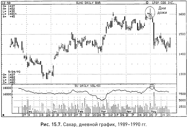 Если достижению ценовых максимумов сопутствуют необычно высокие значения открытого интереса, то это серьезный повод для беспокойства. Рост открытого интереса означает вступление в игру новых продавцов и покупателей, и если цены растут поступательно, то уровни, на которых выставляются стоп-приказы при открытии новых длинных позиций, также постепенно повышаются. В случае резкого падения срабатывание этих стоп-приказов может приобрести характер цепной реакции и спровоцировать обвал. Пример такого развития событий представлен на рисунке 15.7. В течение двух месяцев с начала марта цены на сахар держались в диапазоне $0,15–0,16, при этом открытый интерес заметно вырос во время последней волны подъема, наблюдавшейся в конце апреля, и в первых числах мая достиг необычно высокого уровня. Очевидно, что выходившие на рынок покупатели выставляли защитные стоп-приказы на продажу все выше и выше. Появившаяся затем серия дожи указала на нерешительность быков и возможный откат. Когда 4 мая он начался, один за другим стали срабатывать стоп-приказы, и цены рухнули.