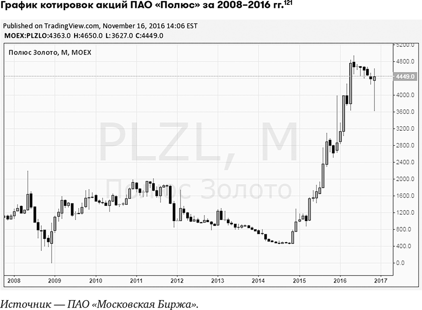 Но по состоянию на 16 ноября 2016 г., когда мы пишем эту книгу, акции ПАО «Полюс» уже не такие прекрасные по цене, как два года назад. Возможно, существует шанс, что они вырастут еще в девять раз, но я считаю это маловероятным. Акции переоценены. Так дорого, как в 2016 г., они не стоили никогда. Судя по графику, акции можно было считать дешевыми, когда они стоили ниже 1200 руб.