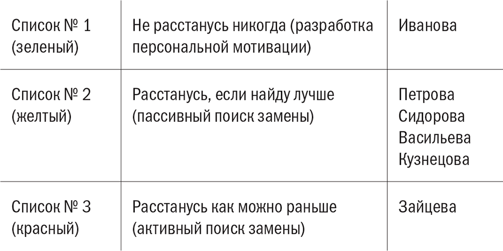 Для более эффективного управления кадрами, находящимися в нашем распоряжении, я очень рекомендую сделать три списка, по которым распределить всех сотрудников, чтобы получился своеобразный светофор, только вверх ногами (табл. 10.1).