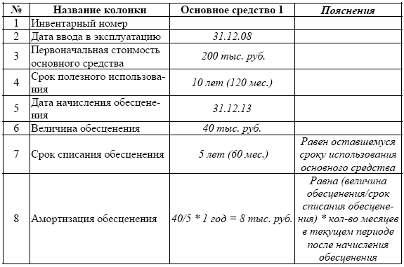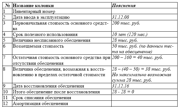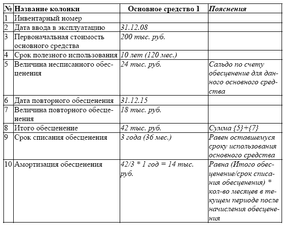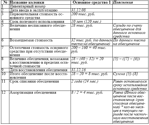 В случае если появились признаки уменьшения обесценения его можно максимально в пределах восстановления возмещаемой стоимости увеличить до остаточной стоимости основного средства, в предположении, что обесценения не было. В таком случае, необходимо заполнить расчетную табл. 5. Разберем пример заполнения и работы с таблицей 5 (в продолжение предыдущего):