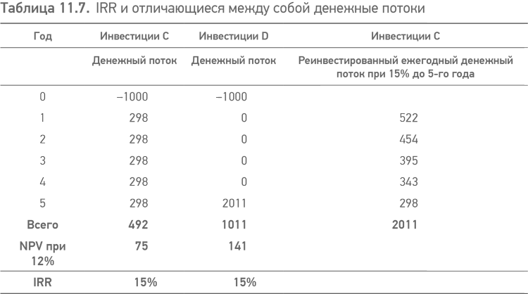 В процессе принятия решения, вкладывать или нет в отдельные проекты, и при рассмотрении влияния изменений в принятых допущениях на доходность вложений инвесторы рассматривают значение IRR и значение NPV. Но при использовании этих величин необходимо соблюдать осторожность и осознавать принцип их расчета. Это может быть проиллюстрировано на примере двух инвестиций, которые представлены в табл. 11.7: очевидно, что инвестиции D обеспечивают лучшую доходность, и значение NPV подтверждает этот вывод, но значения IRR для обеих инвестиций одинаково. Это потому, что в процессе стандартного расчета IRR предполагается, что денежные средства, изымаемые из проекта, рефинансируются по ставке IRR до конца расчетного периода. (Таким образом, как показано в третьей колонке табл. 11.7, если денежные потоки за 1-й, 2-й, 3-й и 4-й годы реинвестировать при 15 % ежегодно, то общая сумма достигнет 2011 к концу 5-го года.) Понятно, что нужно в определенной степени принять к сведению то, что инвестиции С генерируют денежный поток быстрее, но допущение, что эти денежные средства могут быть повторно инвестированы под 15 %, возможно, некорректно или, по меньшей мере, является двойным учетом дохода от инвестиций при такой ставке. Таким образом, значение IRR изначально переоценивает денежные потоки; удлинение периода денежного потока приводит к преувеличению IRR при использовании высокого коэффициента реинвестирования.