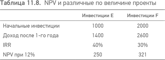 Опять же, при сравнении двух различных проектов показатели должны быть взяты в сопоставимых значениях. Это представлено в табл. 11.8. Инвестиции F имеют более высокий NPV, чем инвестиции Е, но только благодаря большому размеру. Как это видно в процессе расчета IRR, инвестиции Е – это более доходные инвестиции; инвестиции F со стабильным ростом в 1000 при сравнении с инвестициями Е обеспечивают много меньшую доходность.