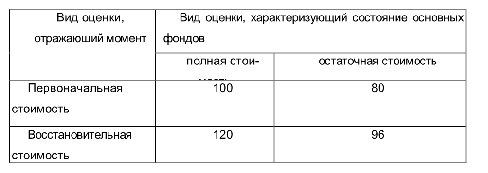 Другие типы оценки – полная и остаточная стоимость – позволяют составить представление о состоянии основных фондов. Полная стоимость – это стоимость новых фондов, а остаточная стоимость – это стоимость их с учетом износа.