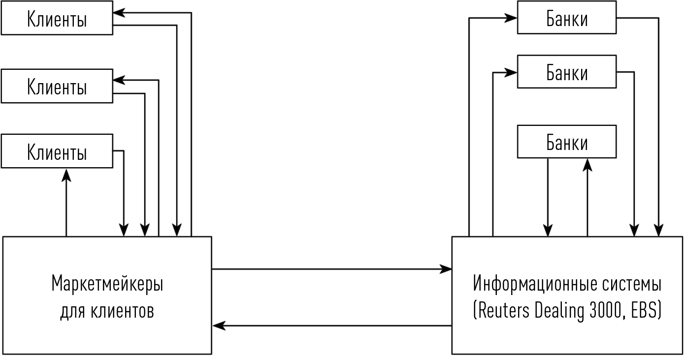 На рис. 1 представлена структурная схема функционирования рынка FX. Банки и крупные участники общаются между собой через Reuters Dealing 2000/3000 или EBS. Мелким клиентам нет необходимости авторизовываться в столь дорогих системах, и они торгуют через маркетмейкеров, которыми могут быть те же банки или брокерские конторы. В приведенной на рис. 1 схеме, маркетмейкеры авторизованы в информационных системах и являются полноценными участниками рынка. Они видят котировки других участников и могут осуществлять торговлю со многими участниками. Клиенты маркетмейкеров обычно могут торговать только со своим маркетмейкером, но для получения спекулятивного дохода этого вполне достаточно.