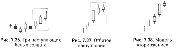 Если вторая и третья свечи либо одна только третья свеча демонстрирует признаки ослабления, то образуется модель отбитое наступление (advance block pattern, см. рис. 7.37). Она означает, что рост цен встречает сопротивление, поэтому с длинными позициями следует быть осторожнее, особенно если до этого наблюдался долгий восходящий тренд. Об ослаблении может свидетельствовать постепенное уменьшение длины белых тел либо формирование у двух последних свечей длинных верхних теней.