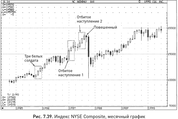 На рисунке 7.39 три белых солдата, возникшие в зоне низких цен в 1985 г., предупредили участников торгов о грядущем ралли, а позже на графике образовалось две модели «отбитое наступление». В первую из них в начале 1987 г. вошли три свечи с последовательно уменьшающимися белыми телами, что не сулило быкам ничего хорошего. Последняя из этих свечей, кроме того, представляла собой падающую звезду. Затем два месяца рынок топтался на месте, а в середине 1987 г. предпринял новую попытку роста, однако образовавшаяся при этом вторая модель «отбитое наступление» послужила очередным предостерегающим сигналом. Главное различие между первым и вторым отбитыми наступлениями заключается в длине верхней тени у последней входящей в них свечи. Хотя во втором случае она не очень длинная, стало очевидным, что рынок не в состоянии закрыться вблизи максимумов. Другими словами, ведущий (то есть наступающий) солдат оказался отбит. В следующем месяце сформировалась свеча «повешенный», после чего «солдаты» отступили окончательно.