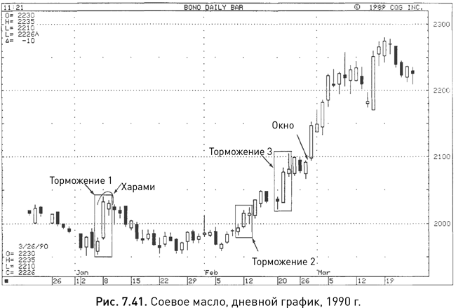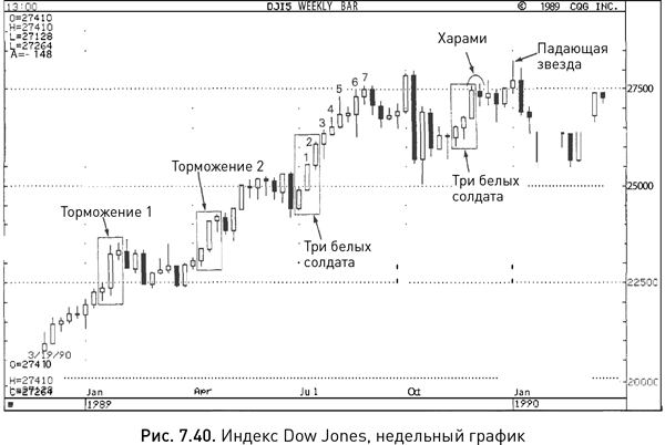 На рисунке 7.40 первая модель «торможение» образовалась в начале 1989 г. после серии белых свечей и временно остановила повышение цен. Аналогичная модель в начале апреля завершилась свечой «повешенный», но, после того как спустя две недели рынок закрылся выше ее максимальной отметки, стало понятно, что снижение маловероятно. В начале июля бычьи три белых солдата положили начало уверенному ралли, во время которого были последовательно достигнуты семь новых максимумов (так называемых рекордных максимумов). Еще раз эта модель образовалась в третьем квартале, и поскольку каждая из входящих в нее свечей закрывалась на максимуме, складывались все предпосылки для новой волны роста, аналогичной той, что наблюдалась в июле. Но этого не произошло: сначала вслед за последней белой свечой трех белых солдат возникла свеча с маленьким телом, и вместе они образовали харами, говорившую о преграде на пути дальнейшего повышения, а через несколько недель эти опасения подтвердила падающая звезда.