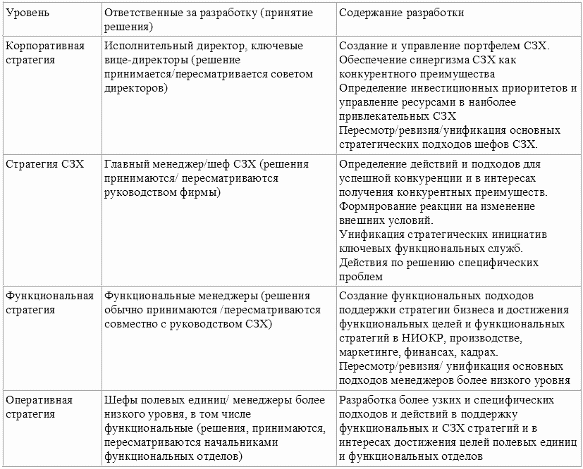 Иерархия разработки стратегии в фирме иллюстрирована табл. 2.1.
