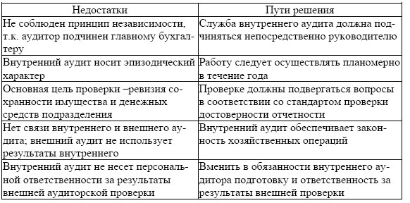 В настоящее время существующий в отдельных экономических субъектах внутренний аудит не имеет всеохватывающего значения и не выполняет возложенные на него функции по подготовке к аудиторской проверке и обеспечению законности хозяйственной деятельности. В акционерном обществе «Подмосковное» внутренний аудит работает с 1993 г. Необходимость его определена большими объемами выпускаемой продукции, наличием самостоятельно функционирующих на условиях полного коммерческого расчета 17 подразделений. Несмотря на положительную роль данного формирования, имеются серьезные недостатки, препятствующие его развитию (табл. 3.8.1.).