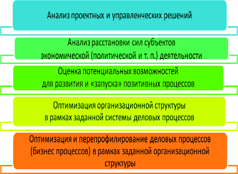 • Аналитика позволяет решать задачи проблематизации, структурирования общего проблемного поля организации, составлять теоретические модели, аналитические карты, карты рисков по главным проблемам с целью более оптимального их решения;