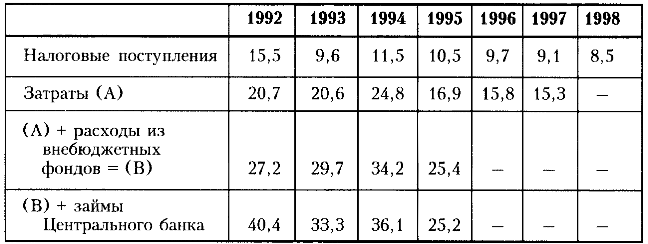 Таблица 3. Налоговые поступления и расходы федерального правительства от российского ВВП, 1992 — 1998 гг. (в процентах)