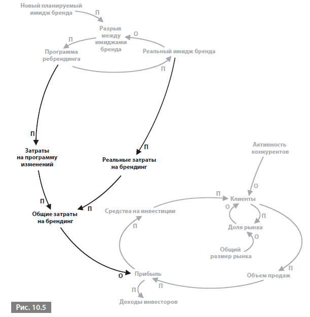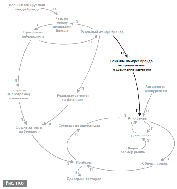 Давайте возьмем, например, элемент новое планируемое количество персонала из уравновешивающей петли. Связан ли он каким-либо образом с элементом клиенты из усиливающей петли? Как стремление нанять еще 300 разработчиков программного обеспечения влияет на базу существующих клиентов или привлечение новых? Возможно, если планы роста компании будут обсуждаться в прессе, это благотворно скажется на репутации фирмы и поспособствует тому, что она попадет в списки участников какого-нибудь тендера. Хорошая реклама также может способствовать росту стоимости акций.