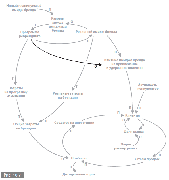 Если вас удивляет эта связь типа О и вам кажется, что там должна быть П, то, возможно, вы не проводите различий между самой программой изменений и ее конечным результатом. Смысл найма, увольнения, обучения заключается, конечно, в повышении влияния хорошего персонала на привлечение и удержание клиентов, то есть это действительно связь типа П. Но это результат программы, а не ее свойство, сама по себе программа действует разрушительно, и это отражено связью типа О. Конечный результат – это связь, идущая не от найма, увольнения, обучения, а от реального количества персонала, увеличенного в результате программы изменений, к влиянию хорошего персонала на привлечение и удержание клиентов, и мы уже обозначили ее как П. В уравновешивающей петле действие обычно бывает временным и разрушительным, и полученное в результате выгодное состояние отражается с помощью реального показателя.