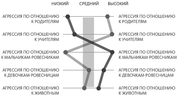Взгляните на рисунок. На нем отображены разные условия, вызывающие агрессивное поведение у двух мальчиков. Диаграммы основаны на реальных данных из исследования Сёды.