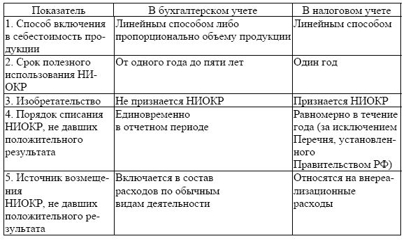 В связи с этим, механизм учета расходов на НИОКР в бухгалтерском и налоговом учете имеют определенные отличительные особенности, некоторые из которых представлены в табл. 1