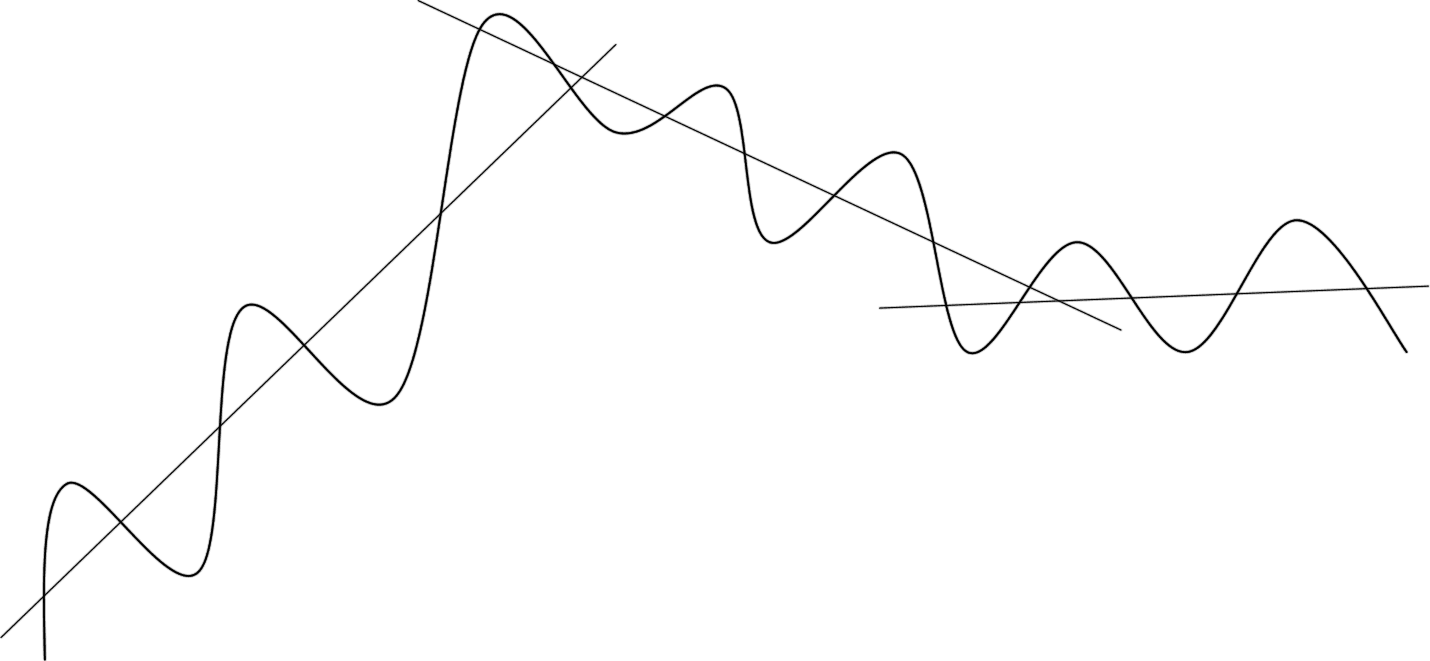 Все рыночные движения сводятся именно к этой незамысловатой схеме. Сложность состоит в том, что непонятно, что выбирать в качестве оси, и неизвестно, когда одна ось потеряет актуальность и начнет работать другая ось, с другим наклоном или направлением. Иными словами, когда изменится тренд.