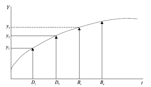 Допустим, на рынке обращаются три облигации: две казначейские дисконтные облигации D1 и D2 с дюрацией один и два года и с доходностями (спот-ставками) у1 и у2 соответственно, и одна купонная облигация Вx со сроком погашения через три года (рис. 6.1).