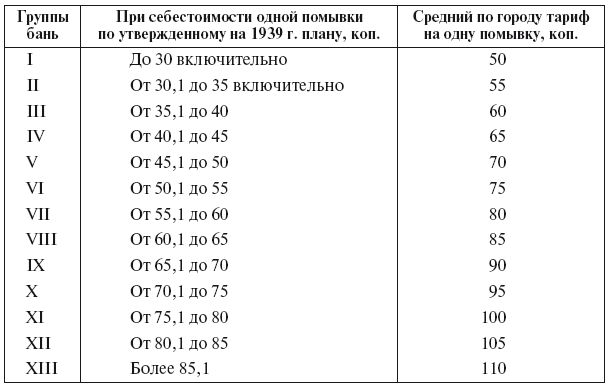 Из отчета «О состоянии банно-прачечного хозяйства в городах РСФСР», подписанного наркомом К.Д. Памфиловым[327], видно, что на 1 января 1939 г. в городах РСФСР было 803 коммунальные бани на 125 тыс. мест. Для сравнения: в 1917 г. в стране насчитывалось всего 384 городских бани, а в начале 1928 г. – 505 бань[328]. Проект постановления СНК РСФСР от 31 августа 1939 г. «О мероприятиях по упорядочению банно-прачечного хозяйства РСФСР» за подписями председателя СНК РСФСР В.В. Вахрушева[329] и К.Д. Памфилова позволяет реконструировать тарифы на пользование банями (табл. 2.7)[330].