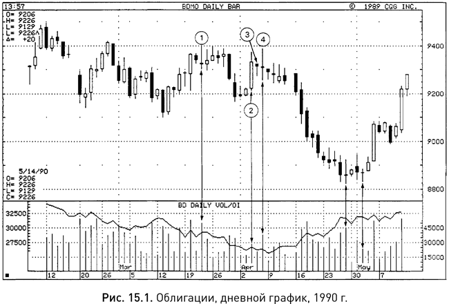 Рисунок 15.1 иллюстрирует, как объем торгов и сигналы свечей могут подтверждать образование двойных вершин и оснований. При формировании свечи 1 от 22 марта цена фьючерса на облигации приближалась к максимальным отметкам конца февраля, а дневной объем торгов составил 504 000 контрактов (см. столбчатый график в нижней части рисунка). В течение следующих нескольких сессий покупатели пытались пробиться выше, но действовали чересчур нерешительно, о чем свидетельствовали маленькие тела соответствующих свечей и невысокие показатели объема. Спустя неделю быки сдались, и рынок всего за пару дней просел на два пункта.