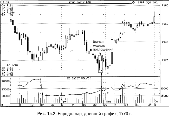 На рисунке 15.2 в конце апреля формирование белой свечи сопровождалось рекордным для последних месяцев объемом торгов. Это свеча вошла в состав бычьей модели поглощения, которая сигнализировала о твердости быков. Чуть позже попытка медведей достичь новых минимумов на фоне низкой торговой активности привела к образованию молотообразной свечи, что подтвердило наличие в этом районе прочного основания.