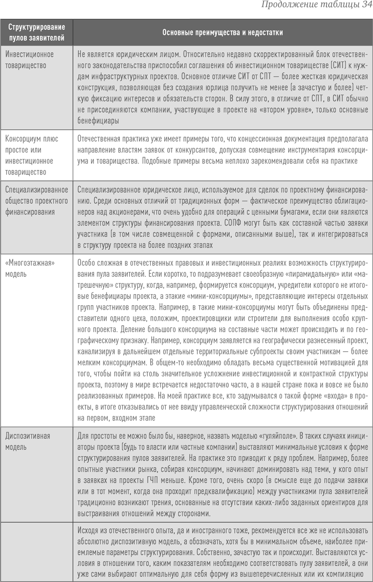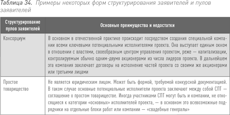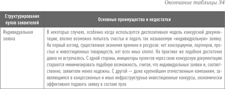 Существует некоторое множество вариантов структурирования пулов заявителей, выдвигаемых в качестве участников на концессионные и иные ГЧП-конкурсы. Выбираемая форма во многом зависит от того, какая конструкция складывается между участниками пула заявителей исходя из наиболее оптимального способа оформления их взаимных экономических интересов. И, конечно же, во многом это предопределяется условиями конкурсной заявочной документации, утвержденной «собственником» конкурса.