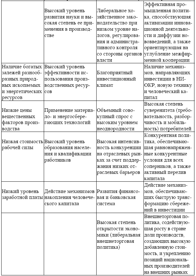 Совершенно иначе обстоит дело со способностью создавать большую потребительную ценность. Это способность создавать продукты, обладающие эксклюзивными свойствами и не имеющие полноценных заменителей, что и позволяет владельцу продукта извлекать высокую стоимость. Различия между источниками макроконкурентоспособности раскрываются в специфике факторов, формирующих источники. При этом суть различия между ними заключается в способе перераспределения стоимости. Способность производить с издержками ниже мировых обеспечивает перераспределение стоимости благодаря более эффективному использованию факторов, а способность создавать большую потребительную ценность обеспечивает перераспределение стоимости за счет применения более эффективных факторов.