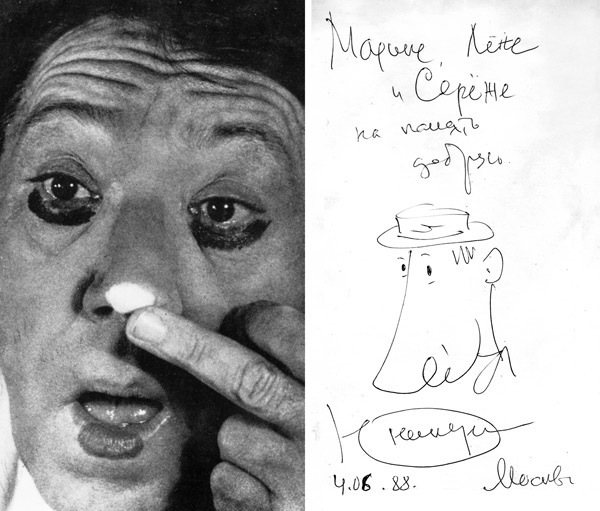 А тогда, после представления, мы ехали в метро, оглушенные светом рампы, трубами музыкантов, перед глазами скакали кони и летали воздушные гимнасты. Как величайшую драгоценность, несли мы домой фотографию Никулина с надписью и автопортретом. Поскольку Юрий Владимирович надписал фотографию на обороте, мы придумали повесить ее на ниточку. Чтобы она поворачивалась к нам то лицом Никулина, то автографом.